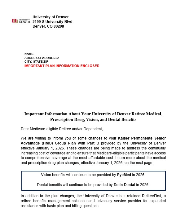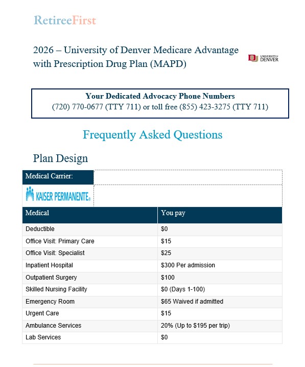 For any questions, please continue to reach out to your University of Denver dedicated team of Retiree Advocates Monday through Friday 8:00 am – 5:00 pm MST.