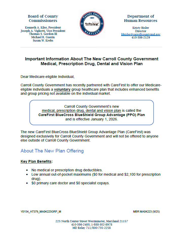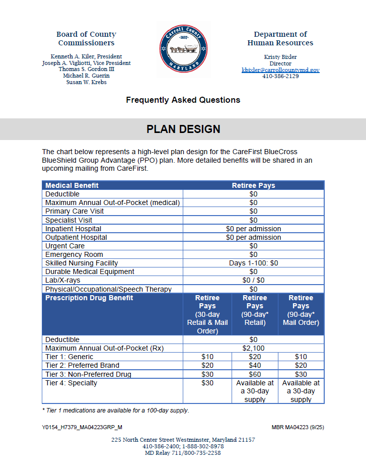 For any questions, please continue to reach out to your Carroll County Government dedicated team of Retiree Advocates Monday through Friday 8:00 am – 5:00 pm EST.