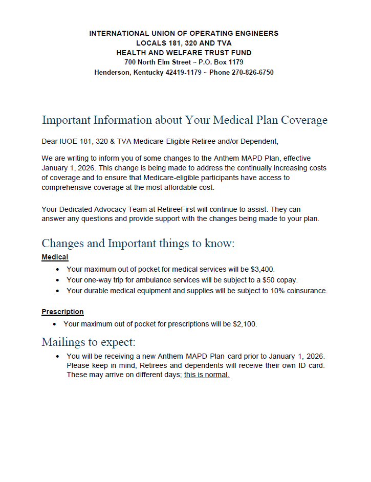 Welcome to the RetireeFirst Advocacy page for International Union of Operating Engineers Locals 181,320 & TVA Health and Welfare Trust Fund.